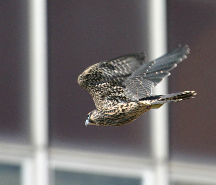 Esperanza after taking off from the building across from Kodak. She flew towards the tower, then circled back and headed out to the middle smokestack.