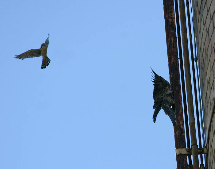 Here's a kestrel making a run at Esperanza, who is clinging to the ladder on the middle stack. Shortly after this she flew over to the north stack catwalk.